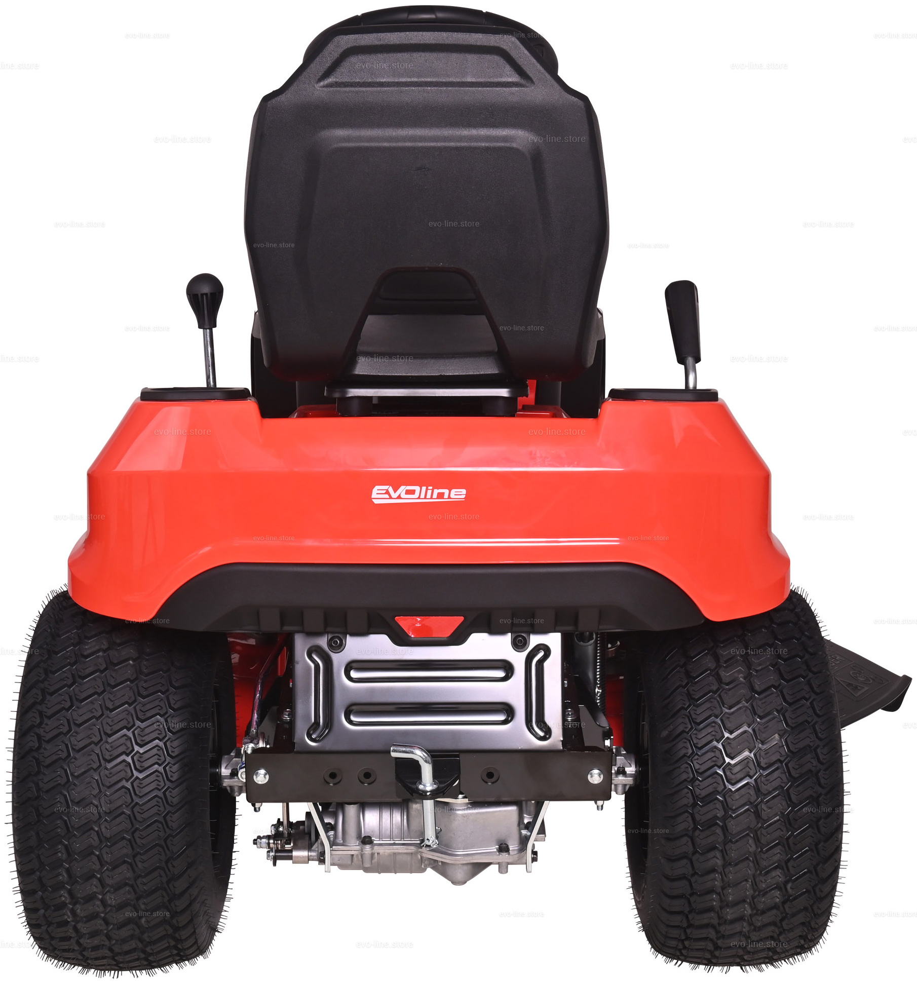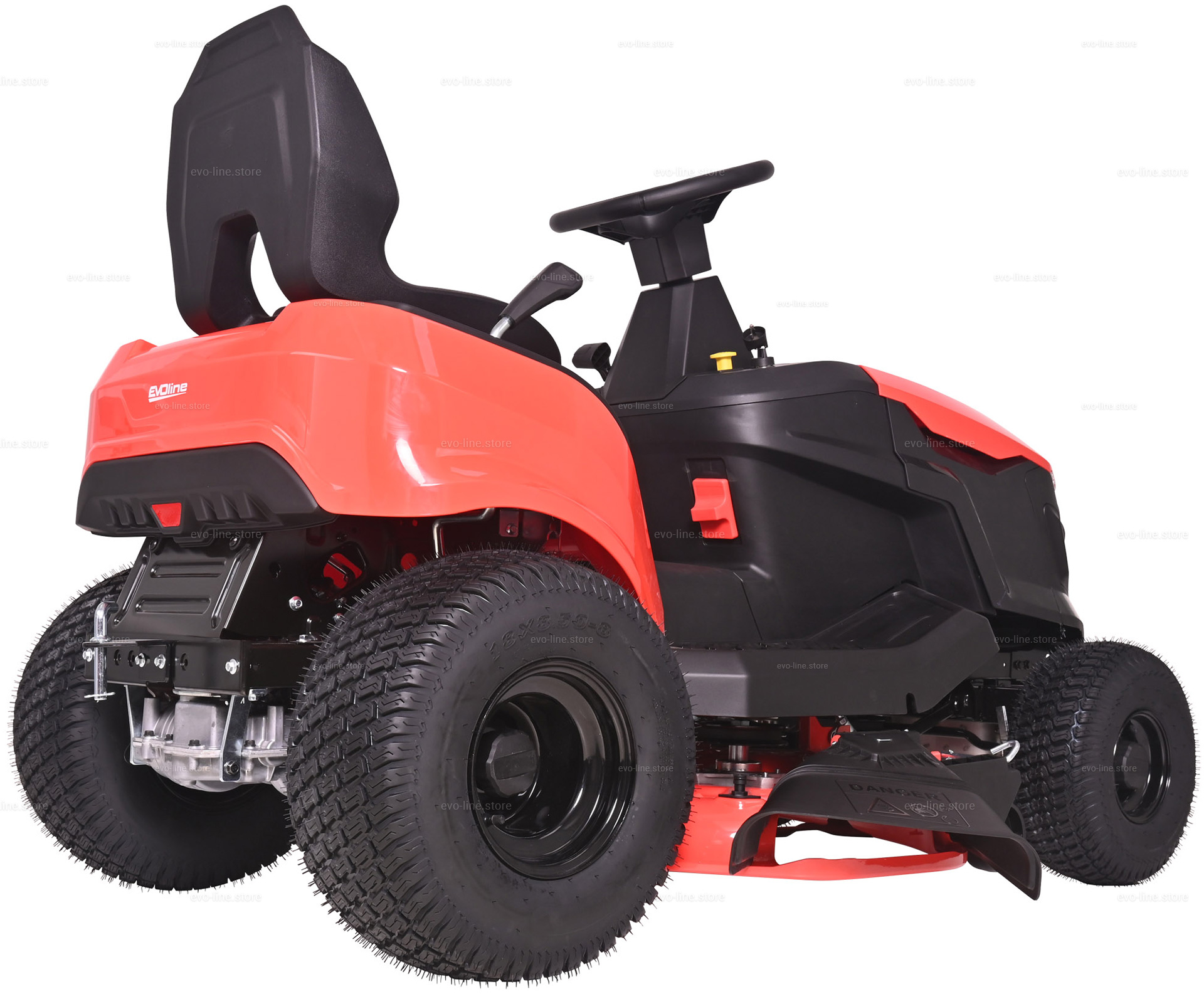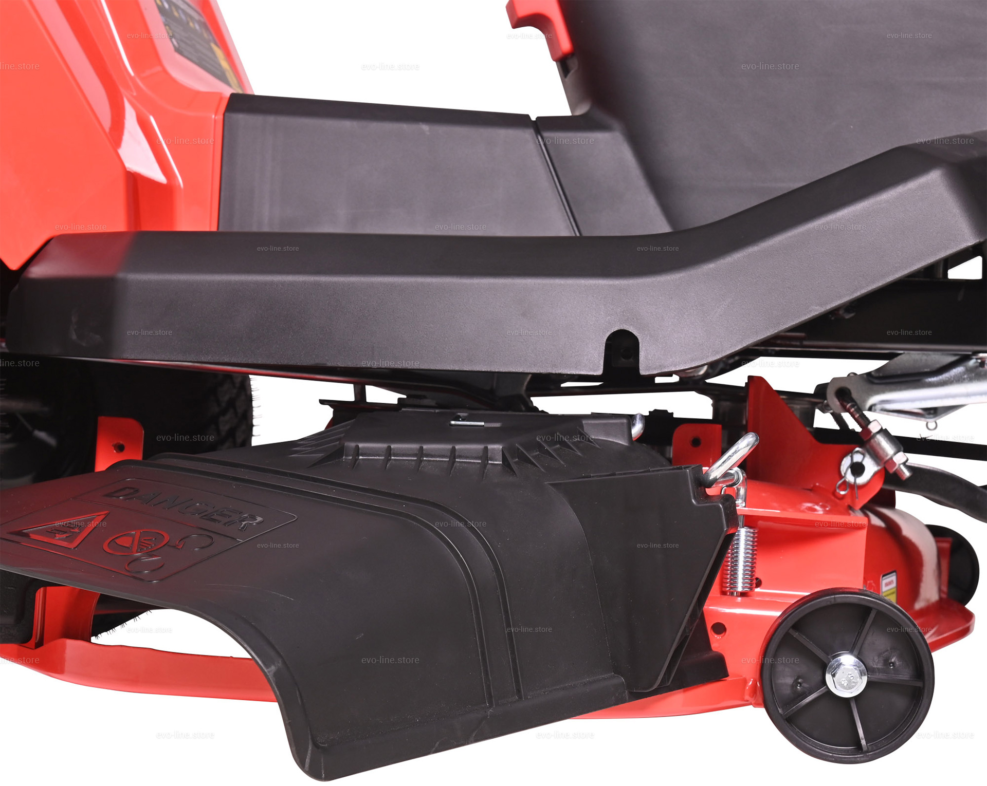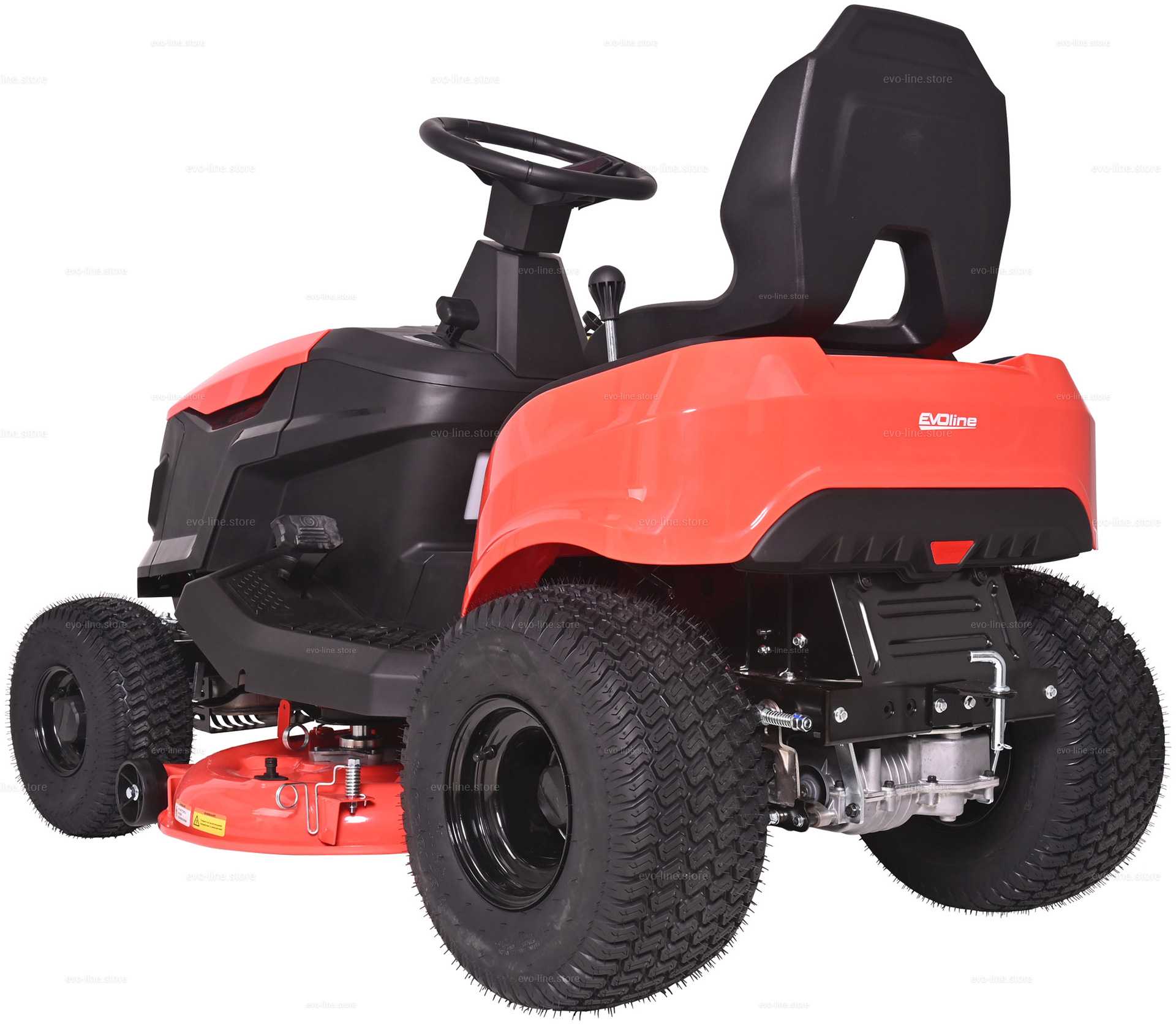 - Садовый трактор EVOline TRG 98 M оснащен системой обратного управления (СОУ) — позволяет косить при движении задним ходом. В целях безопасности необходимо убедиться, что на участке нет детей и животных.